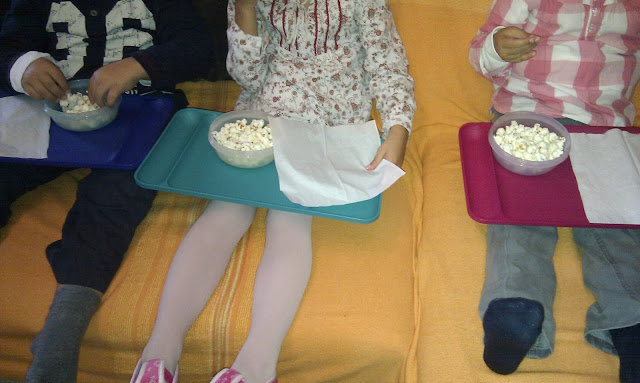 filme, pipocas, jogo da glória e pinturas.