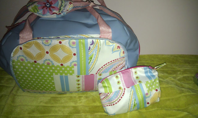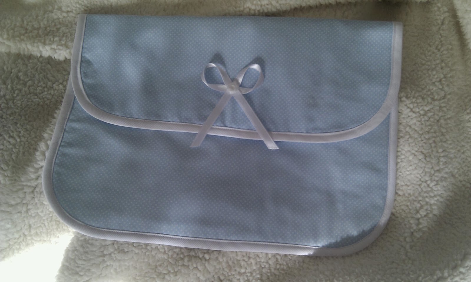 Desta vez,meti mãos à "obra" e escolhi tecidos e fitas de viés para a elaboração de bolsas para as diárias da baby. Não fui eu que as fiz pois não tenho máquina nem sei de costura. Disse como as queria e a avó e a tia da baby fizeram ;) Sou uma sortuda! A bolsa para a primeira roupa comprei e bordei.