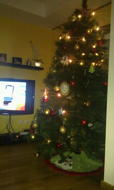 Pois bem... a nossa árvore fica assim...tem coisinhas que a M. vai fazendo... daí que não seja "fashion" mas seja a nossa árvore!