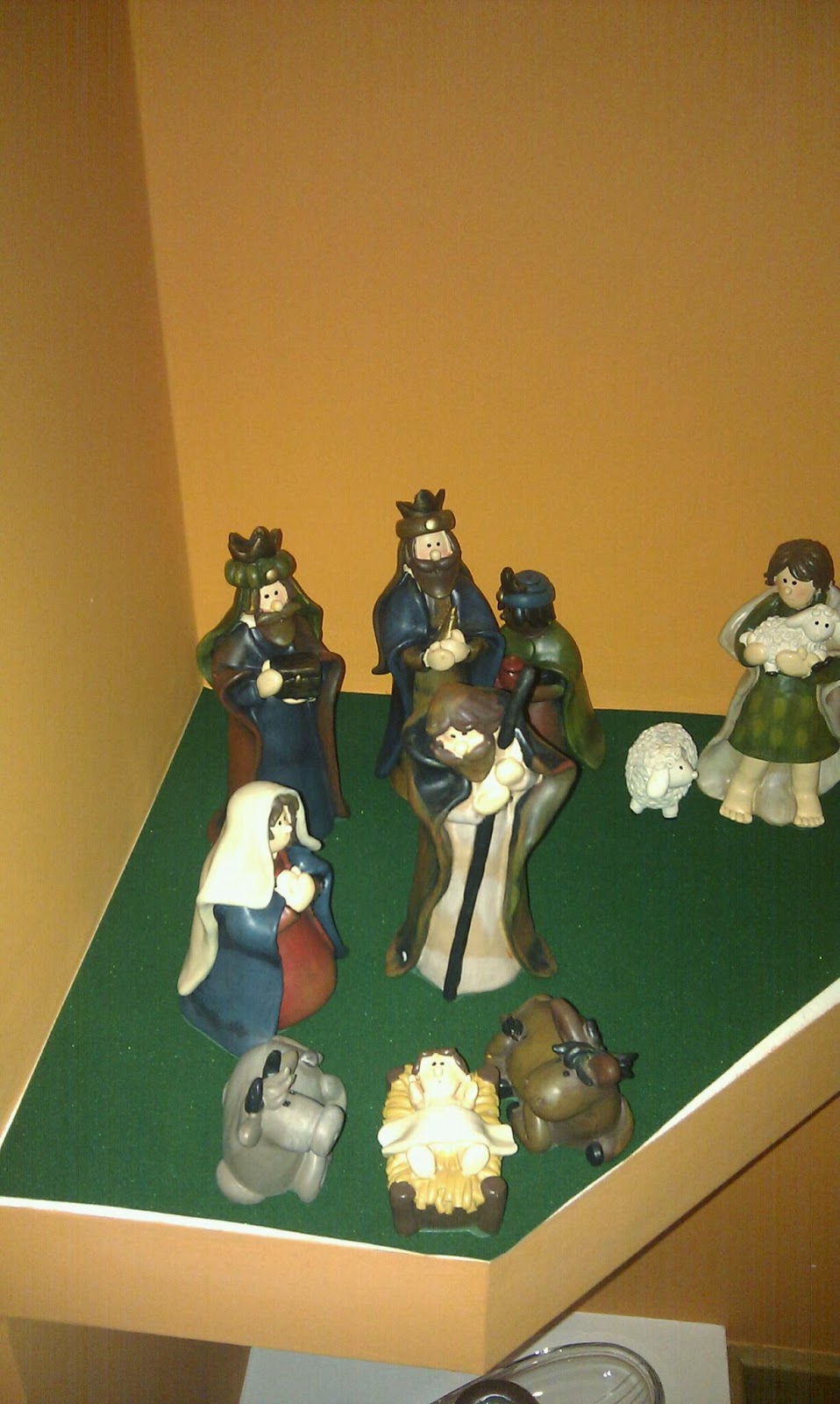 O presépio é de 2006 e foi oferecido pela amiga M. quando viemos cá para casa. Este ano colocámos papel veludo nas bases das figuras para não riscar. A piolha ajudou.