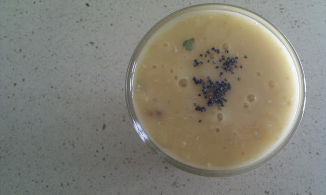 Para este copo (enorme) usei: 2 tangerinas, 1 pêra rocha, leite de Soja, farelo de aveia, salsa, levedura de cerveja e sementes de papoila.