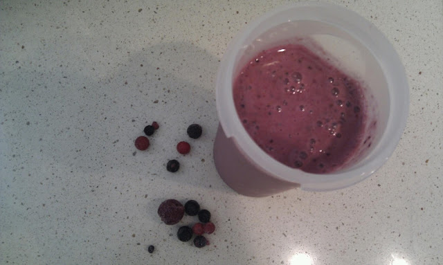 Para começar bem o dia, depois de amamentar e antes de fazer umas máquinas de roupa (que o tempo está ótimo e à tarde é para sair de casa) bebi esta bebida pink: Leite, frutos vermelhos, cereais, chia, linhaça e levedura de cerveja.
