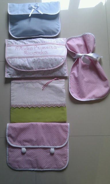 Para levar para a maternidade, quando a Mar. nasceu, comprei um saquinho para a primeira roupinha, que bordei a ponto cruz. Desta vez fiz o mesmo para a Sal., no entanto também queria levar as restantes roupas em saquinhos. Foi então que os imaginei e pedi às avós da Mar. que os costurassem. A tia também percebe do assunto e ajudou dando ideias e "engendrando". Os saquinhos ficaram giros... com pouco faz-se muito.